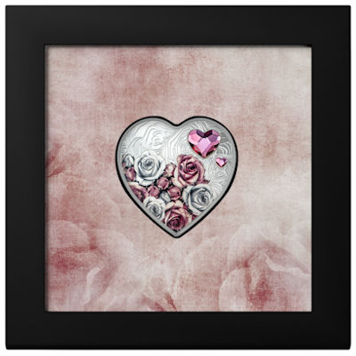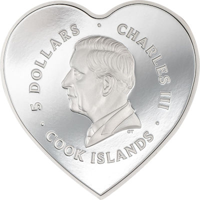 Die geprägten und teils kolorierten Rosen nehmen die ganze Fläche der herzförmigen Silbermünze ein. Sie ist in der höchsten Prägequalität Polierte Platte hergestellt und 37 mal 37 Millimeter groß. Bei einem Feingehalt von 999,9/1000 enthält sie 20 g Silber. Da die Cook Islands das Ausgabeland sind, zeigt die Wertseite nun das Porträt von Charles III. Der Nennwert ist mit 5 Dollars angegeben. Ausgeliefert wird das Silberherz gekapselt, in einem hübschen Präsentationsetui und mit einem Echtheitszertifikat.