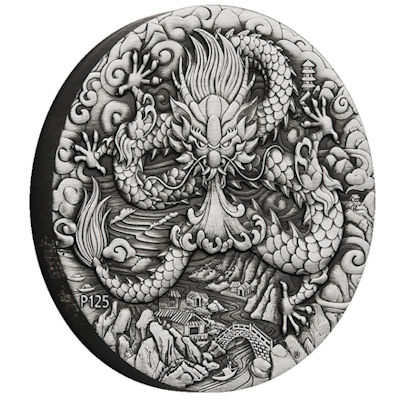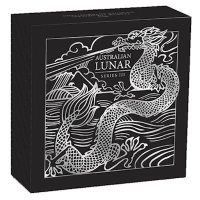 Als einziges Fabelwesen im chinesischen Tierkreis und als früheres Symbol des Kaiserhauses hat der Drache eine ganz besondere Stellung. Er verheißt Glück und Wohlstand. Die Designer der Perth Mint haben für die neuen Lunar-Ausgaben einen beeindruckenden Drachen erschaffen, der einen Schwall Wasser direkt in Richtung des Betrachters speit. Der schlangenartige Leib des Fabelwesens füllt den Himmel aus. Unter ihm sind Berge, Häuser und terassenförmige Felder sowie ein Fluss mit Booten zu erkennen. Anders als in Europa beherrschen die asiatischen Drachen besonders das nasse Element und sorgen für eine gute Ernte, indem sie genügend Regen bringen.
