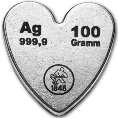 Der herzige Gussbarren von Heimerle + Meule hat eine Größe von 41,30 mal 39,0 Millimetern. Er enthält 100 g Feinsilber und hat einen Feingehalt von 999,9/1000. Diese beiden Angaben sind zusammen mit dem Logo des Herstellers umseitig zu finden. Ein solches Herz braucht natürlich auch eine angemessene Verpackung. Deshalb wird der Silberbarren in Folie und in einem Geschenketui ausgegeben. So wird er zum ebenso schönen wie wertbeständigen Geschenk für einen lieben Menschen.