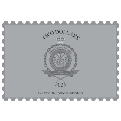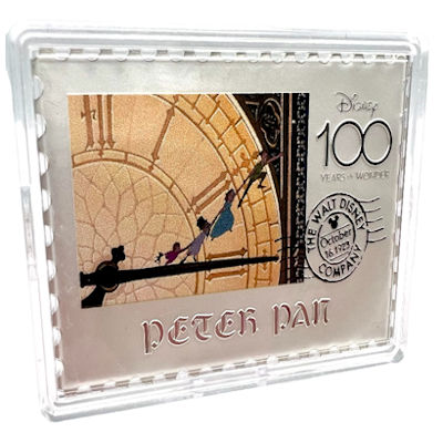 Das Sammlerstück enthält 1 oz Feinsilber bei einem Feingehalt von 999/1000. Es ist 53 mal 36 Millimeter groß und einer Briefmarke nachempfunden. Der „Stempel“ zeigt einen Micky-Maus-Kopf und verweist auf das Gründungsdatum der Wald Disney Company. Darüber ist das Jubiläumslogo zu sehen. Unten ist der Name Peter Pan verzeichnet. Auf der Wertseite findet man das offizielle Siegel des Ausgabelands Niue. Der Nennwert ist mit zwei Dollars angegeben. Die Silbermünze, die in höchster Prägequalität Polierte Platte gefertigt ist, wird gekapselt, im Etui und mit Echtheitszertifikat ausgegeben.