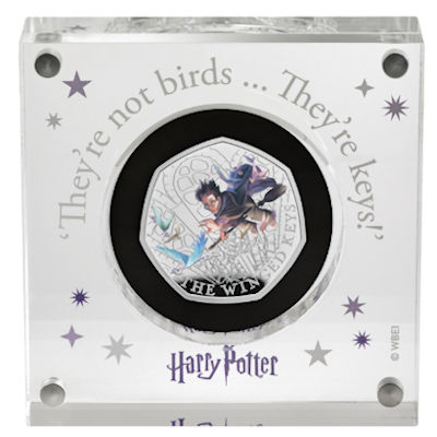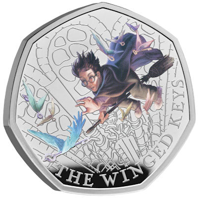 Die Silbermünze zeigt ihn, wie er bereits die Hand nach dem richtigen Schlüssel ausgestreckt hat. Harry Potter und die Schlüssel sind farbig gestaltet, der silberne Hintergrund zeigt die Tür. Das Sammlerstück ist in der höchsten Prägequalität Polierte Platte hergestellt. Es hat eine siebeneckige Form und einen Durchmesser von 27,3 Millimetern. Es enthält 8 Gramm Feinsilber bei einem Feingehalt von 925/1000. Der Nennwert liegt bei 50 Pence. Auf der Wertseite ist das Porträt von König Charles III. zu finden. Ausgeliefert wird die Silbermünze in einem Präsentationsetui mit dem Zitat „They’re not birds… They’re keys!“ Eine Umverpackung und ein Echtheitszertifikat gehören dazu.