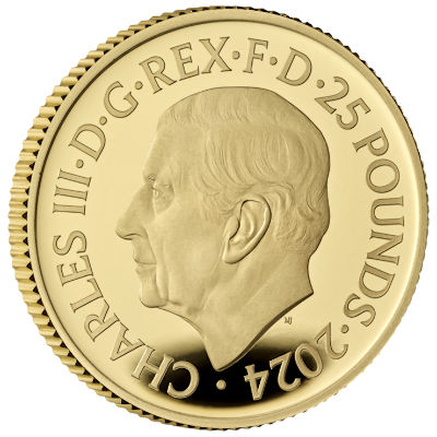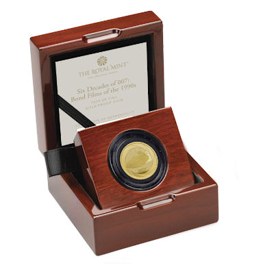 Die Goldmünze konzentriert sich auf die schlanke Form des Schnellboots mit Bond am Steuer. Der Rahmen erinnert an das Pistolenlauf-Detail aus dem 007-Vorspann. Unten ist auch das Logo mit der Pistole aufgeprägt. Das Sammlerstück ist in höchster Proof-Qualität hergestellt und hat einen Durchmesser von 22,00 Millimetern. Es enthält 1/4 oz Feingold bei einem Feingehalt von 99,99 Prozent. Die Wertseite zeigt das Porträt von König Charles III. und den Nennwert von 25 Pfund. Der Münzrand ist geriffelt. Die Goldmünze wird gekapselt, im stilvollen Holzetui und mit Echtheitszertifikat ausgegeben.
