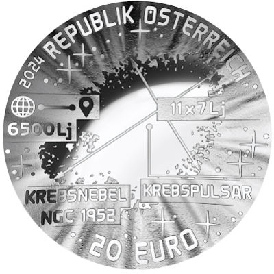 Umseitig verweist das Sammlerstück auf Krebsnebel und Krebspulsar als Überreste einer Supernova im Sternbild Krebs, in etwa 6500 Lichtjahren Entfernung zur Erde. Die Explosion dieser Supernova wurde im Jahr 1054 in China, Japan und Amerika beobachtet. Unten ist der Nennwert von 20 Euro aufgeprägt. Die Silbermünze ist in höchster Prägequalität Polierte Platte hergestellt und hat einen Durchmesser von 34 Millimetern. Der Münzrand ist glatt. Die Silbermünze hat einen Feingehalt von 925/1000 und ein Gewicht von 22,420 Gramm. Ausgeliefert wird sie in einem Etui und einem Schuber. Ein Echtheitszertifikat gehört dazu. Zu der Serie gibt es eine Sammelkassette.