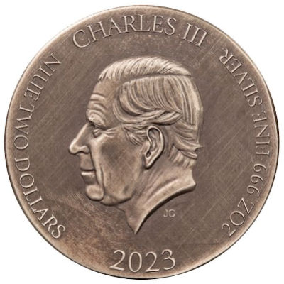 Oben ist der Name „Sermon on the Mount“ eingraviert. Das Sammlerstück zeigt viele Details der Vorlage und lädt mit seiner randlosen Gestaltung dazu ein, sich ganz in die Szene zu versenken. Es enthält 2 oz Feinsilber bei einem Feingehalt von 999/1000. Der Durchmesser liegt bei 39 Millimetern. Die Wertseite zeigt ein Porträt von König Charles III., der nun das offizielle Staatsoberhaupt des Ausgabelandes Niue ist. Randläufig ist der Nennwert von 2 Dollars angegeben. Unten findet man die Jahreszahl. In den glatten Münzrand ist die Seriennummer eingraviert. Auch das Etui der Silbermünze passt zum Thema: Es ist wie eine ledergebundene Bibel gestaltet.