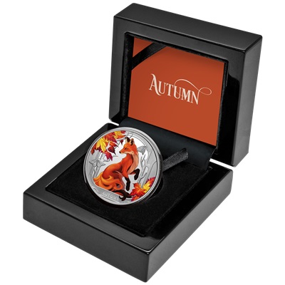 Mit seinem rotbraunen Fell passt der Fuchs ausgezeichnet zu den gelben, orangen und weinroten Schattierungen der Herbstblätter auf dem Motiv dieser lebendig kolorierten Silbermünze. Der üppige Schweif, die elegante Haltung der schwarzen Pfoten und die fensterartige Umrahmung verleihen der Szene eine märchenhafte Atmosphäre. Rotfüchse sind weit verbreitet. Sie treten in europäischen Fabeln ebenso auf wie in der japanischen Mythologie. In Australien sind sie verbreitet, seit englische Siedler sie zur Fuchsjagd einführten. Dort entwickelten sie sich jedoch schnell zur Bedrohung für die einheimischen Beuteltiere.