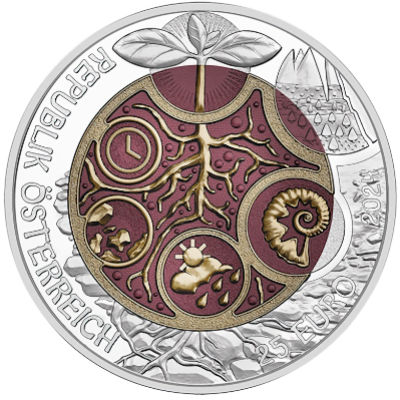silber-niob-edaphon-3Auf der Wertseite der Silber-Niob-Münze sprießt eine Pflanze aus dem Boden. Der Nennwert von 25 Euro ist auf dem silbernen Rahmen um den Niob-Kern verzeichnet. Das Sammlerstück enthält 9 Gramm Feinbsilber bei einem Feingehalt von 900/1000 und hat einen Durchmesser von 34 Millimetern. Es ist in der Qualität hangehoben hergestellt und wird im Etui, mit Umverpackung sowie einem nummerierten Echtheitszertifikat ausgegeben. Die Kombination aus Silber und Niob hat die Münze Österreich schon länger im Programm. Vorangegangene Ausgaben beschäftigen sich mit Themen wie Evolution, Kosmologie, Zeit, Mikrokosmos, Anthropozän, künstliche Intelligenz, gläserner Mensch und Mobilität der Zukunft.