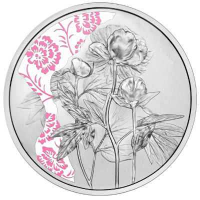 Das Motiv der Silbermünze zeigt die Pfingstrosen-Blüten in verschiedenen Stadien, sowohl als dicke Knospe als auch als üppige, voll entfaltete Blüte. Im Hintergrund sind stilisierte Pfingstrosen in Farbe dargestellt. Die Wertseite präsentiert eine Verkörperung der Blume in Gestalt einer jungen Frau. Das Sammlerstück ist in höchster Prägequalität Polierte Platte hergestellt und hat einen Durchmesser von 32 Millimetern. Das Gewicht liegt bei 16,820 Gramm, der Feingehalt bei 925/1000. Der Münzrand ist glatt. Der Nennwert beträgt 10 Euro. Ausgeliefert wird das Sammlerstück im Etui und einem Schuber, inklusive Echtheitszertifikat.