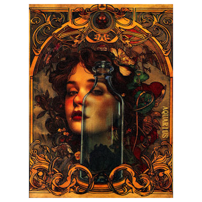 Das Jugendstil-Bild auf dem Motiv zeigt eine junge Frau hinter einer Wasserflasche. Rechts ist das Sternzeichen verzeichnet. Das Sammlerstück enthält 1/2 oz Feinsilber (Feingehalt: 999/1000) und ist 99 mal 73 Millimeter groß. Ausgabeland ist Kamerun. Der Nennwert liegt bei 500 Francs. Die Wertseite zeigt Muchas Tierkreiszeichen-Bild aus dem Jahr 1896: Eine rothaarige Dame im Profil steht in der Mitte des Kreises, auf dessen Bahn die Sterzeichen mit ihren Symbolen angeordnet sind. Die Silbermünze wird in einem Acryl-Display, mit Umverpackung und Echtheitszertifikat ausgegeben.