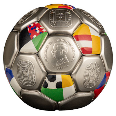 Wer wird Fußball-Europameister 2024? Heute fällt die Entscheidung in Berlin. Egal, wer gewinnt, auf dieser Silbermünze mit Ausgabeland Solomon Islands sind alle teilnehmenden Nationen vertreten. Auch die verschiedenen Stadien sind aufgeprägt. Das macht den kolorierten Silber-Fußball zum idealen Andenken. Er hat eine streng limitierte Auflage von nur 2024 Exemplaren.
