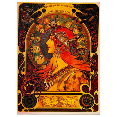 sternzeichen-skorpion-halbe-oz-silber-wertseiteDie Silbermünze zeigt den Skorpion mit erhobenem Stachel. Die Gestaltung ist an den Stil des Künstlers Alphonse Mucha angelehnt. Die Wertseite zeigt dessen Tierkreiszeichen-Bild aus dem späten 19. Jahrhundert: um den Kopf einer Frau im Profil sind die Sternzeichen angeordnet. Der Nennwert von 500 Francs ist oben zu finden. Als Ausgabeland fungiert Kamerun. Die Silbermünze enthält 1/2 oz Feinsilber bei einem Feingehalt von 999/1000. Sie ist 99 mal 73 Millimeter groß. Das Sammlerstück wird in einem Acryl-Display, mit Umverpackung und Echtheitszertifikat ausgegeben.