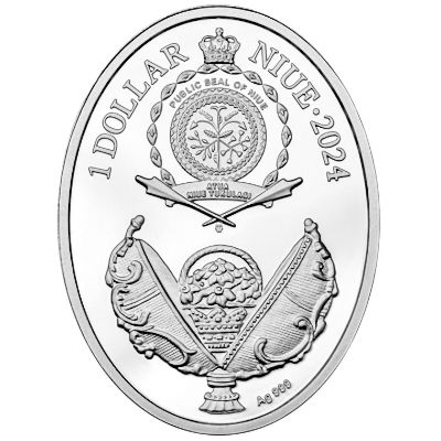 faberge-spring-mauve-egg-2024-wertseiteDie Silbermünze stellt die im Ei enthaltene Überraschung mit den drei Porträts dar. Das Sammlerstück ist 29,20 mal 39,0 Millimeter groß und enthält 1 oz Feinsilber bei einem Feingehalt von 999/1000. Die Wertseite zeigt ein geöffnetes Fabergé-Ei. Darüber findet man das Siegel des Ausgabelands Niue. Der Nennwert von 1 Dollar ist seitlich angegeben. Das Sammlerstück ist in ein Etui mit fürstlichem Tapetenmuster als Hintergrund gebettet. Ein Echtheitszertifikat gehört dazu.