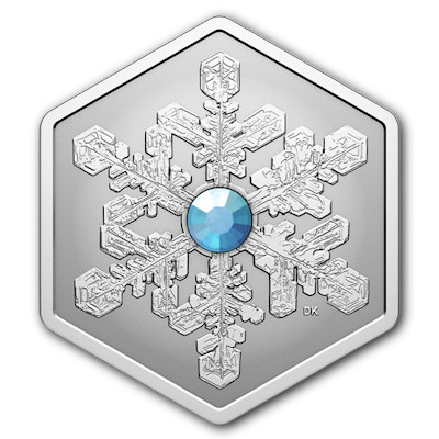 „Der Winter ist die schönste Jahreszeit, und Schneeflocken sind der Beweis dafür“, so zitiert die Royal Canadian Mint den Fotografen Don Komarechka, von dem die Vorlage für das Motiv der Silbermünze stammt. Die sechs Arme des Schneekristalls, die von der sechseckigen Form des Sammlerstücks widergespiegelt werden, erzeugen den Eindruck von Symmetrie. Wer genau hinschaut, bemerkt jedoch: Das ist eine Illusion. Jede Schneeflocke hat ihre ganz individuelle Form, so auch der Sternendendrit, den Komarechka eingefangen hat. In den Mittelpunkt ist ein eisblauer Kristall eingesetzt, der den winterlichen Eindruck noch verstärkt.
