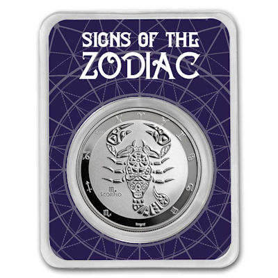 Für alle, die ein verspielteres Design bevorzugen, ist vielleicht die Zodiak-Silbermünze Skorpion im Stil von Alphonse Mucha das Richtige.
