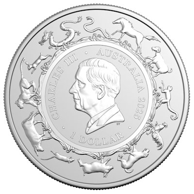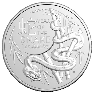Die Silbermünze präsentiert eine Schlange, die sich elegant um Bambusstangen windet. Das chinesische Schriftzeichen und die Aufschrift „Year of the Snake“ ergänzen das Bild. Auch das Gewicht von 1 oz Feinsilber und der Feingehalt von 999/1000 sind auf dieser Seite angegeben. Umseitig wird die Schlange im Tierkreis präsentiert. Sie ist oben zu sehen, wo sie dem Drachen nachfolgt und ihrerseits vom Pferd verfolgt wird – wie in der Legende des großen Wettrennens. In der Mitte findet man das Porträt von König Charles III. und den Nennwert von einem Dollar. Die in Stempelglanz-Qualität geprägte Silbermünze hat einen Durchmesser von 40 Millimetern und eine Auflage von 50.000 Stück.