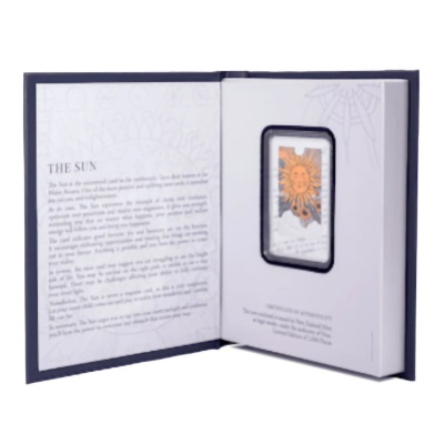 Der silberne Rahmen um das Motiv lässt die Münze wie eine Spielkarte erscheinen. Unten ist der Name The Sun, aufgeprägt, oben die Nummer 19 in römischen Ziffern. Das Sammlerstück enthält 1 oz Feinsilber. Es ist 53,00 mal 36,00 Millimeter groß und trägt den Nennwert von zwei Dollars. Die Wertseite zeigt das offizielle Siegel des Inselstaats Niue, der als Ausgabeland fungiert. Auf der Wertseite greift die Bordüre am Rand das Spielkarten-Design auf. Ausgegeben wird die Silbermünze gekapselt und in einem buchartigen Etui, das ein paar Informationen zu der Tarot-Karte liefert. Ein Echtheistzertifikat gibt es dazu.