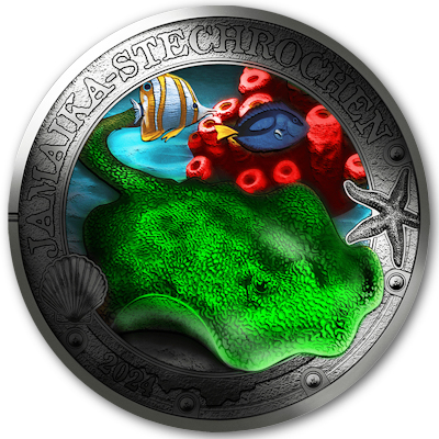 Betrachtet man die Sammelmünze bei Tageslicht, sieht man die Tarnfarbe des Rochens: Gelb bis braun und gemustert ist er am Meeresboden nicht so leicht zu entdecken. Mit einer Länge von unter 80 Zentimetern gehört er zu den kleineren Rochen. Ein Mantarochen kann etwa eine Spannweite von bis zu sieben Metern erreichen. Der Jamaika-Stechrochen ist, anders als die großen Verwandten, nahezu rund. Der Giftstachel ist auf der Oberseite des Tiers. Die Rochen leben nahe der amerikanischen und karibischen Küsten und ernähren sich hauptsächlich von Garnelen.