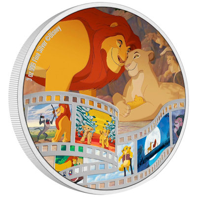 Der König der Löwen ist inzwischen 30 Jahre alt, aber bis heute einer der erfolgreichsten Zeichentrickfilme. Zu Beginn des Films herrscht der Weise Mufasa. Doch sein Sohn Simba muss dessen Tod miterleben und flieht von Schuldgefühlen geplagt ins Exil, wo er zu einem stattlichen Löwen heranreift. Das Königreich überlässt er einstweilen seinem Onkel Scar, dem Bösewicht der Geschichte. Doch am Ende rafft er sich dazu auf, es zurückzuerobern und setzt die Löwendynastie fort. Einige Szenen aus dieser Geschichte sind auf dem Motiv der Silbermünze abgebildet, durch die unten ein Filmstreifen läuft. Darauf sieht man zum Beispiel, wie Simba den Tieren als Thronfolger präsentiert wird.