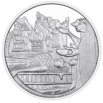 oesterreich-das-weisse-gold-des-salzkammerguts-ritus-3Umseitig ist eine Brandbestattung dargestellt. Der Verstorbene liegt aufgebahrt auf dem Rücken, während die Begräbnisrituale durchgeführt werden. In Hallstatt sind sowohl Brandgräber als auch Körperbestattungen entdeckt worden. Die Silbermünze ist in der höchsten Prägequalität Polierte Platte hergestellt und hat einen Durchmesser von 34 Millimetern. Der Rand ist geriffelt. Der Feingehalt liegt bei 925/1000, das Gewicht bei einer 2/3 Unze. Ausgeliefert wird dieses Sammlerstück für Geschichtsfans gekapselt, in einem Etui und mit Echtheitszertifikat.