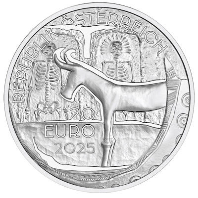 oesterreich-das-weisse-gold-des-salzkammerguts-ritus-2Viele Informationen, die Forscher über vorgeschichtliche Kulturen gesammelt haben, stammen aus Gräbern. So auch in Hallstatt, wo im 19. Jahrhundert ein großes Gräberfeld am Salzberg entdeckt wurde. Die Grabbeigaben zeigen, dass die Menschen, die hier in der Eisenzeit lebten, ausgedehnte Handelsbeziehungen pflegten und zu einigem Wohlstand gelangt waren. Grundlage dafür war Salz, das „weiße Gold„, das hier abgebaut wurde. Die Wertseite der Silbermünze zeigt im Hintergrund zwei Gräber mit Skeletten. Vorne ist als eindrucksvolles Fundstück aus dem Gräberfeld abgebildet, ein Schöpfgefäß mit einer Kuh und einem Kälbchen, wobei auf dem Motiv nur die Kuh zu erkennen ist. Daneben findet man den Nennwert von 20 Euro.