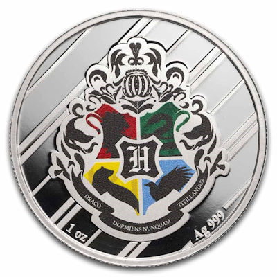 hogwarts-haeuser-ravenclaw-1-oz-silber-koloriert-3Das Symbol des Hauses Ravenclaw ist der Adler, seine Farben sind Blau und Bronze. Die Silberprägung zeigt zwar einen Vogel auf einem blau gestreiften Wappen, statt eines Bronzetons ist man aber lieber bei Silber geblieben. Das Sammlerstück enthält 1 oz Feinsilber bei einem Feingehalt von 999/1000 und einem Durchmesser von 39,0 Millimetern. Es ist in Stempelglanz-Qualität geprägt. Umseitig findet man das Hogwarts-Wappen, auf dem die Symbole aller vier Häuser vereint sind. Die Blisterverpackung mit Harry-Potter-Logo zeichnet die Silberunze als lizenziertes Produkt aus der „Wizarding World“ von Harry Potter aus.