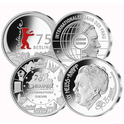 20-Euro-Silbermünzen-2025-komplettsatz-verpacktGeburtstage und Jubiläen sind beliebte Anlässe für die deutschen Gedenkmünzen. Das gilt auch 2025: Eine Ausgabe feiert die 75. Berlinale. Diese Silbermünze ist teilweise koloriert: Hier sticht der rote Bär hervor. Eine weitere Edition ehrt das Jubiläum des Müttergenesungswerks, das vor 75 Jahren von der Politikerin und Ehefrau des ersten deutschen Bundespräsidenten Elly Heuss-Knapp gegründet wurde. Die dritte Ausgabe erinnert an das Internationale Jahr der Frau, das 1975 von den Vereinten Nationen ausgerufen wurde. In diesem Jahr fand die erste Weltfrauenkonferenz statt. Es gibt aber auch noch weitere Themen, wie die vierte Silbermünze des Jahrgangs 2025 zeigt. Sie ist der Stadt Chemnitz gewidmet, die in diesem Jahr eine Kulturhauptstadt Europas war.