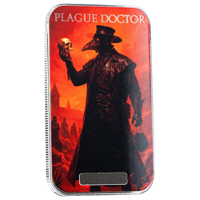 Im Mittelalter wütete die Pest, der Schwarze Tod, in Europa. Als Symbol für diese schreckliche Seuche steht der Pestarzt mit dem langen Gewand und der gruseligen Schnabelmaske. Ihn hat die Scottsdale Mint in ihre Silberbarren-Serie Halloween Monsters aufgenommen, zusammen mit Gestalten wie Frankensteins Monster und dem Zyklopen. Geprägt aus einer Unze Feinsilber ist der Barren sicher das Richtige für Halloween-Fans.