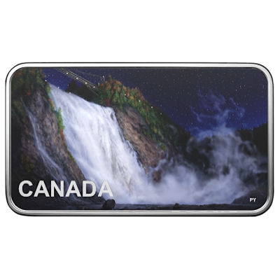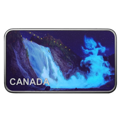 Mit 83 Metern Fallhöhe ist der Montmorency-Fall in Québec höher als die Niagara-Fälle. Das in den Sankt-Lorenz-Strom stürzende Wasser ist ein atemberaubender Anblick, den das Motiv der Silbermünze einfängt. Zuerst beeindruckt das Naturphänomen, dann lässt das Schwarzlicht die geisterhafte Gestalt einer Frau im weißen Kleid erscheinen und verleiht der Szene eine fantastische Note. Das kolorierte Sammlerstück ist 49,8 mal 28,6 Millimeter groß und enthält 1 oz Feinsilber bei einem Feingehalt von 99,99 Prozent. Es hat einen glatten Rand. Umseitig findet man das Porträt von König Charles III. Der Nennwert ist mit 20 CAD angegeben. Die Silbermünze wird im Etui und mit nummeriertem Echtheistzertifikat ausgegeben. Die Auflage ist auf 6.500 Stück limitiert.