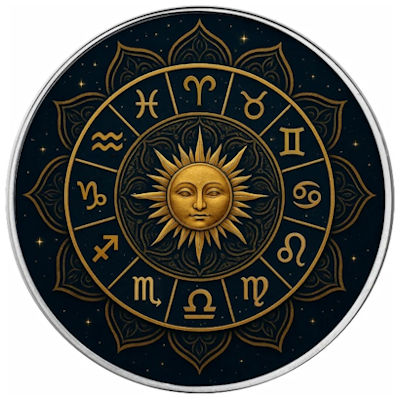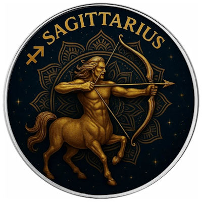 Voll ins Schwarze trifft das Motiv der Silbermünze. Der Zentaur als Symbol für den Schützen ist vor dem Nachthimmel abgebildet. Das atsronomische Zeichen des Sternbilds und der lateinische Name Sagittarius sind ebenfalls verzeichnet. Die Silbermünze hat einen Durchmesser von 40,60 Millimetern und enthält 1 oz Feinsilber bei einem Feingehalt von 999/1000. Als stark veränderte Sonderausgabe der American Silver Eagle, hat sie keinen gültigen Nennwert. Umseitig zeigt das Sammlerstück die Symbole aller Sternzeichen, die rund um die Sonne angeordnet sind. Ganz oben ist der Widder zu sehen, untern die Waage. Ausgegeben wird die in Stempelglanz-Prägung hergestellte Münze gekapselt und im Etui.