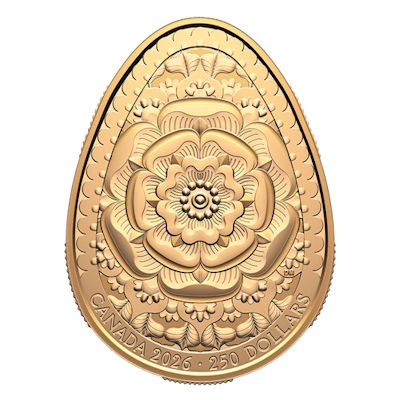 Eine Rose entfaltet ihre Blütenblätter auf der neuesten Pysanka-Goldmünze der Royal Canadian Mint. Das Design ist gleichzeitig eine Hommage an die Fertigungsweise der ukrainischen Oster-Schmuckstücke und ein Symbol der Widerstandfähigkeit und der Schönheit des Lebens. Das in der höchsten Prägequalität hergestellte Sammlerstück hat die Form eines Eis und eine streng limitierte Auflage von nur 350 Exemplaren.