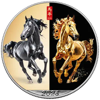 Schwarz auf Gold und Gold auf Schwarz – so galoppiert das Pferd auf dieser Sonderausgabe der Silbermünze American Silver Eagle durch das Jahr 2026. Das Sammlerstück hat passend zur Jahreszahl eine limitierte Auflage von 2026 Exemplaren. Es ist eine Geschenkidee für Pferdefans sowie für alle, die nach dem chinesischen Horoskop unter dem Zeichen des Pferds geboren sind.