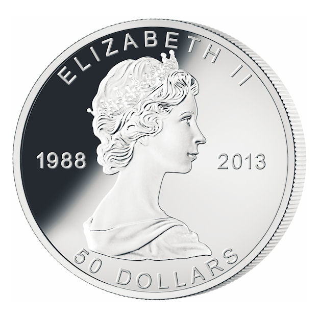 Die Rückseite ist natürlich dem namengebenden Ahornblatt vorbehalten. Auch der Feingehalt von 999,9/1000 und das Gewicht von fünf Unzen sind hier zu finden, ebenso wie die Aufschrift „25th anniversary“ – 25-jähriges Jubiläum. Die Silbermünze hat einen Durchmesser von 65 Millimetern und wird im Etui mit nummeriertem Echtheitszertifikat ausgeliefert. Der Nennwert liegt bei 50 Dollars.