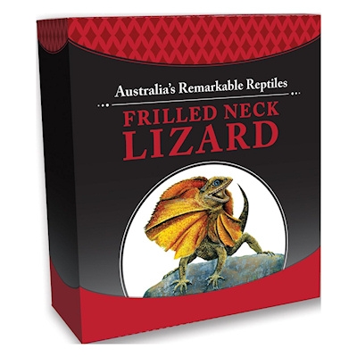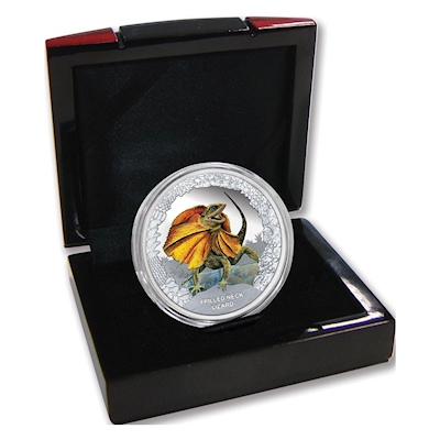 Das kolorierte Motiv zeigt die Kragenechse mit typischer Drohgebärde. Umgeben ist sie von einem Muster aus Reptilienhaut. Der Durchmesser der Silbermünze beträgt 40,60 Millimeter bei einer Stärke von maximal 4 Millimetern. Das Feingewicht liegt bei einer Unze (Feingehalt 999/1000). Ausgabeland dieser Silber-Serie ist Tuvalu. Die Sammlerstücke werden im Etui, Shipper und mit nummeriertem Echtheitszertifikat ausgeliefert, die Auflage ist auf 5.000 Stück begrenzt.