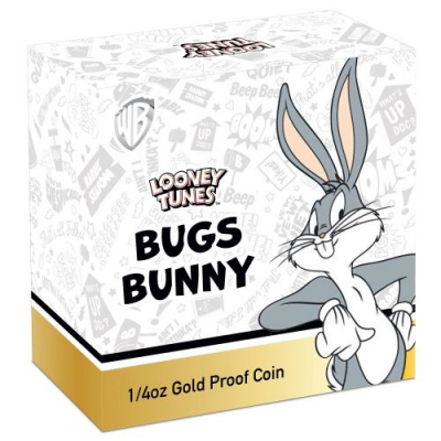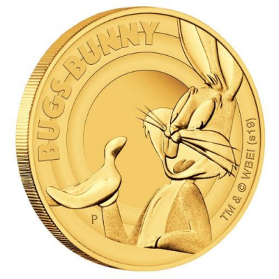 Bugs Bunny hatte seinen ersten Auftritt 1940 im Zeichentrickfilm „Die Hasenfalle“ (Originaltitel: „A Wild Hare“). Der schlaue Hase, der lässig an seiner Karotte knabbert und immer eine schlagfertige Antwort parat hat, wurde schnell zum Publikumsliebling. Heute hat Bugs Bunny sogar einen Stern auf dem Walk of Fame in Hollywood. Auf dem Motiv der Goldmünze lehnt er ganz nonchalant in den Ringen des Looney-Tunes-Logos. Oben ist der Name Bugs Bunny verzeichnet, rechts am Rand findet sich ein Copyright-Hinweis.