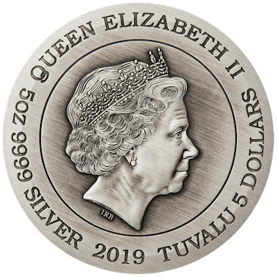 Ein Muster zwischen den Tierkreiszeichen und dem Bagua sowie stilisierte Wolken am äußeren Rand vervollständigen das Motiv. Mit ihrem Durchmesser von 55,50 Millimetern bietet die Silbermünze dem vielfältigen Motiv viel Raum. Die maximale Stärke des Sammlerstücks liegt bei 8 Millimetern. Der Münzrand ist glatt. Dass die Münze 5 oz Feinsilber bei einem Feingehalt von 99,99 Prozent enthält, ist auf der Wertseite vermerkt. Diese zeigt das offizielle Staatsoberhaupt des Ausgabelands Tuvalu, Königin Elizabeth II. Der Nennwert ist mit 5 Dollars angegeben. Ein aufwendiges Antik-Finish lässt die Silbermünze wie ein altes Artefakt wirken. Ausgeliefert im Etui und einem schön gestalteten Shipper ist sie ein prächtiges Sammlerstück, zu dem natürlich auch ein nummeriertes Echtheitszertifikat gehört.