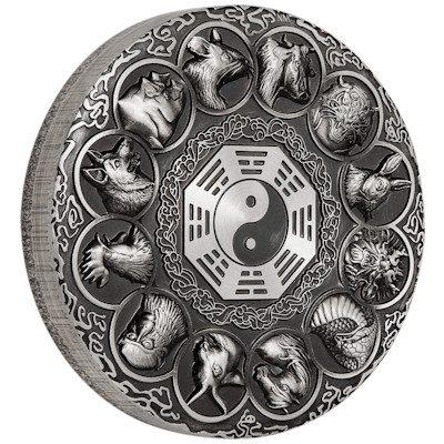 Auf dem Motiv der Silbermünze sind die zwölf chinesischen Tierkreiszeichen im Kreis angeordnet. Den Anfang macht ganz oben die Ratte oder Maus. Danach geht es im Uhrzeigersinn weiter: Ochse, Tiger und Hase folgen. Das fünfte Zeichen ist das einzige Fabeltier: der Drache. Nach ihm regiert ein Jahr lang die weise Schlange, dann sind Pferd, Ziege und der schlaue Affe an der Reihe. Hahn, Hund und Schwein komplettieren den Kreis. Dessen Mittelpunkt bildet ein Yin-und-Yang-Zeichen. Es ist umgeben von einem Bagua: Dabei handelt es sich um acht Trigramme, die jeweils aus einer Kombination von durchgehenden und unterbrochenen Linien bestehen. Jedes dieser Symbole steht für ein Element oder Konzept. Das Symbol ganz oben steht zum Beispiel für das Feuer, das Trigramm mit den drei durchbrochenen Linien repräsentiert die Erde und die Kombination von drei durchgezogenen Linien steht für den Himmel.