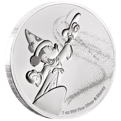 Mit Zauberhut und erhobenem Zeigefinger ist Micky auf dem Motiv der Silbermünze zu sehen. Ein Funkenschweif symbolisiert die Magie, die hier gerade zum Einsatz kommt. Unten am Rand findet man die Angaben zum Feingewicht von 1 oz und dem Feingehalt von 999/1000. Die Bullionmünze hat einen Durchmesser von 40 Millimetern und einen geriffelten Rand. Die Wertseite zeigt das Ian-Rank-Broadley-Porträt von Königin Elizabteh II. und das Ausgabeland Niue. Der Nennwert liegt bei zwei Dollars. Die Silberanlagemünzen werden in Tubes zu 25 Stück verpackt.