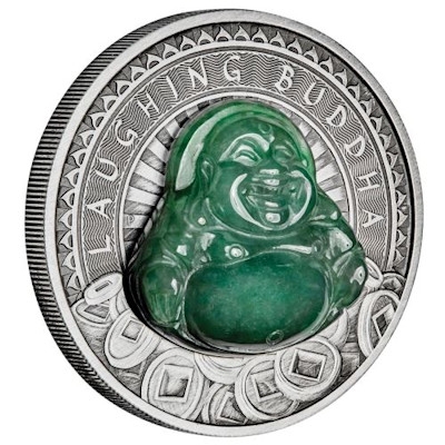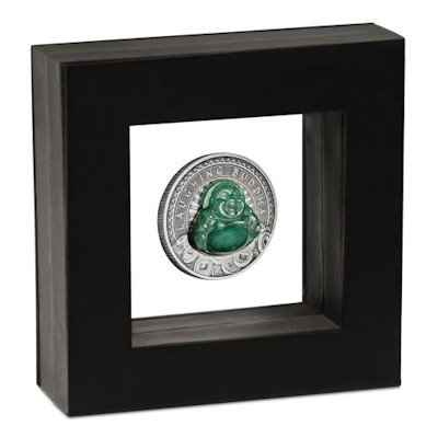 Die Buddhafigur ist aus echter Jade gerfertigt. Ein Antikfinish auf der Silbermünze sorgt dafür, den sanften Glanz des Steins zur Geltung zu bringen. Der Hintergrund besteht aus stilisierten Strahlen und dem Schriftzug „Laughing Buddha“. Der Münzrand ist geriffelt. Auch das Porträt von Königin Elizabeth II. auf der Wertseite ist von Strahlen umkränzt. Am Rand findet man die Nennwertangabe von 1 Dollar. Ausgabeland ist Tuvalu. Die Silbermünze enthält 1 oz Feinsilber bei einem Feingehalt von 99,99 Prozent. Sie hat einen Durchmesser von 40,6 Millimetern. Ausgeliefert wird sie in einem Präsentationsetui, sodass die Münzsammler beide Seiten betrachten können, ohne das Sammlerstück herauszunehmen. Einen Shipper und ein nummeriertes Echtheitszertifikat gibt es außerdem dazu.