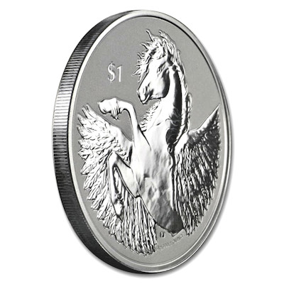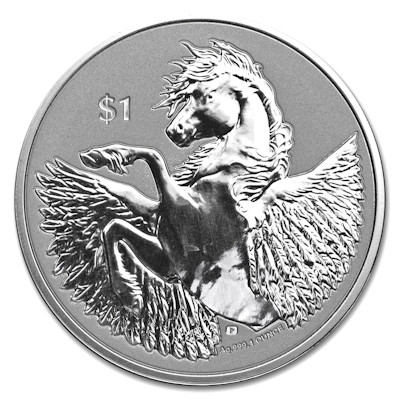 british-virgin-islands-pegasus-1-oz-silber-2Die Silbermünze zeigt Pegasus als steigendes Ross mit wehender Mähne und ausgebreiteten Flügeln. Sie hat den Durchmesser von 38,60 Millimetern und einen Feingehalt von 999/1000. Ausgabeland sind die British Virgin Islands. Obwohl die Inseln zu Großbritannien gehören, ist wie auf den benachbarten U.S. Virgin Islands der US-Dollar die Landeswährung. Der Nennwert von 1 Dollar ist neben dem Pferdekopf zu finden. Umseitig zeigt die Silbermünze aber auch ein Porträt von Königin Elizabeth II.