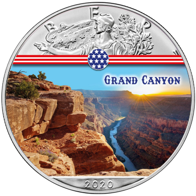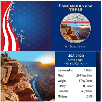 Eine Sammler-Serie der Anlagemünze American Silver Eagle zeigt dieses Jahr Wahrzeichen der USA auf kolorierten Motiven. Zu den Top Ten der Touristenmagnete gehört neben der Freiheitsstatue, dem Empire State Building und dem Mount Rushmore auch der Grand Canyon in Arizona. Ein Panoramabild fängt die Faszination der Landschaft für den Betrachter ein. Die Silbermünze hat eine limitierte Auflage von 2.500 Stück.