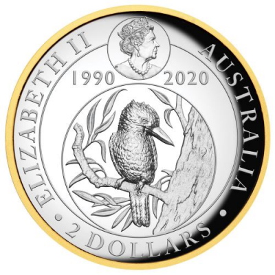 Umseitig wurde das Jody-Clark-Porträt von Königin Elizabeth II. deutlich verkleiner und nach oben verschoben, um Platz für das Motiv der ersten Kookaburra-Ausgabe zu schaffen. Es zeigt einen Kookaburra auf dem Ast eines Eukalyptusbaums. Darüber sind die Jahreszahlen 1990 und 2020 aufgeprägt. Der Nennwert von 2 Dollars ist unten zu finden. Das Sammlerstück aus 1 oz Feinsilber (Feingehalt: 99,99 Prozent) hat einen Durchmesser von 40,90 Millimetern und eine maximale Dicke von 7,28 Millimetern. Es wird im Etui, mit passender Umverpackung und nummeriertem Echtheitszertifikat ausgegeben.