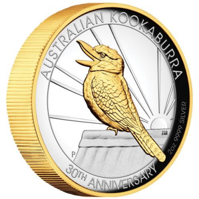 Bei Sonnenaufgang lässt der Kookaburra sein Lachen hören: So zeigt es das Motiv der Silbermünze und so erleben es viele Australier jeden Morgen, denn der große Vogel ist nicht nur im Outback zu Hause, sondern fühlt sich auch in Gärten wohl. Während das Wellblechdach, auf dessen First das Tier sitzt, und die Sonnenstrahlen silbern sind, ist der Kookaburra auf dieser Edition in High Relief glänzend vergoldet. Das gilt auch für den Rand des Motivs und den geriffelten Münzrand. Oben findet man den Namen „Australian Kookaburra“, unten weist die Aufschrift „30th Anniversary“ die Münze als Jubiläumsausgabe aus.