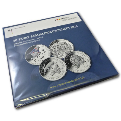 20-euro-sammlermuenzen-silber-2020Eine ideale Gelegenheit für Sammler der 20-Euro-Silbermünzen aus Deutschland ist das Set in Spiegelglanz-Qualität: So bekommen sie alle vier Sammlerstücke auf einmal. Die vier Münzen aus Sterling-Silber sind liebevoll gestaltet. Die Themenvielfalt reicht dieses Jahr von Märchen über Lügengeschichten und geniale Musik bis hin zu einem Stadtjubiläum.
