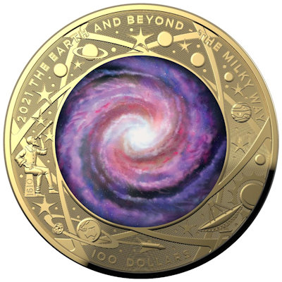 Das Motiv der Goldmünze zeigt die Spiralgalaxie der Milchstraße von außen, doch eigentlich sind wir ein Teil von ihr. Unser Sonnensystem liegt relativ weit außen, unsere Sonne ist einer von zwischen 100 und 200 Milliarden Sternen. Einige solche Himmelskörper sind auf dem goldenen Rahmen aufgeprägt, der das kolorierte Zentrum des Sammlerstücks umgibt. Außerdem wirft man hier einen Blick in die Geschichte der Astronomie: Links erkundet ein Forscher wie einst Galileo mit einem Fernrohr den Himmel. Ganz unten ist der Nennwert von 100 Dollars verzeichnet.
