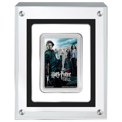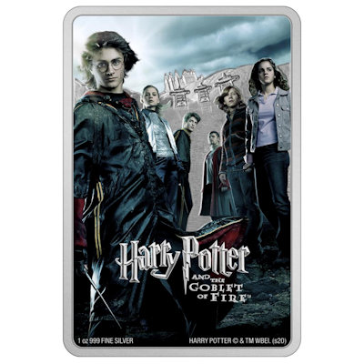 Seine beiden Freunde stehen auch auf dem Filmplakat hinter Harry. Außerdem sind seine Konkurrenten im Turnier zu sehen, links Fleur und Cedric, rechts der schweigsame Viktor Krum. Unten ist der Filmtitel Harry Potter and the Goblet of Fire vermerkt. Die kolorierte Silbermünze ist 36 mal 53 Millimeter groß und enthält 1 oz Feinsilber (Feingehalt 999/1000). Der Münzrand ist geriffelt. Die Wertseite zeigt das Rank-Broadley-Porträt von Königin Elizabeth II. über dem Nennwert von 2 Dollars. Als Ausgabeland fungiert Niue. Das in höchster Proof-Qualität geprägte Sammlerstück wird in einem Präsentationsetui aus Plexiglas und einem Shipper mit Harry-Potter-Design ausgegeben, inklusive nummeriertem Echtheitszertifikat.