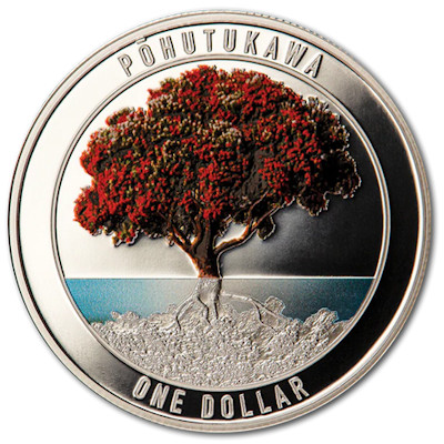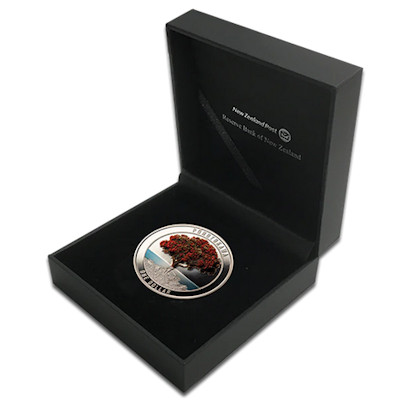 Die Silbermünze zeigt einen großen Pōhutukawa in voller Blüte. Der Baum steht einsam an der Küste, sodass seine Krone sich im Wasser spiegelt. Das Bild ist von einem Rahmen umgeben, auf dem der Nennwert von 1 Dollar verzeichnet ist. Das Sammlerstück hat einen Durchmesser von 40 Millimetern und entält 1 oz Feinsilber bei einem Feingehalt von 999/1000. Die Wertseite zeigt das Ian-Rank-Broadley-Porträt von Königin Elizabeth II. Darunter findet man die Jahreszahl 2021. Die kolorierte Silbermünze in der höchsten Prägequalität Polierte Platte wird im Etui und inklusive eines nummerierten Echtheitszertifikats ausgeliefert.