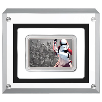 star-wars-guards-executioner-trooper-1-oz-silber-koloriert-etuiStormtrooper, Klonkrieger, Death Trooper, Preatorian Guard, Knights of Ren und Executioner Trooper – in ihren Rüstungen sind sie gesichtslos und ununterscheidbar. Die Executioner Troopers sind jedoch keine eigene Einheit. Immer wieder werden andere First-Order-Soldaten dafür eingeteilt, die anstehenden Hinrichtungen zu übernehmen – und die gibt es bei der totalitären Ersten Ordnung nicht zu knapp. Die Auf gabe des Scharfrichters ist gleichzeitig ein Loyalitätstest für diejenigen, die sie ausführen müssen.