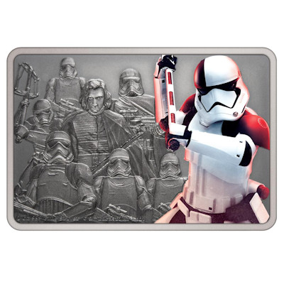 star-wars-guards-executioner-trooper-1-oz-silber-koloriert-wertseiteDer Executioner Trooper mit erhobener Axt dominiert das Motiv der Silbermünze. Weiß und blutrot koloriert hebt er sich vom silbernen Hintergrund ab, dem ein Antik-Finish eine bedrohliche Atmosphäre verleiht. Zu sehen ist hier Kylo Ren, umringt von weiteren Soldaten. Die in Proof-Qualität geprägte Silbermünze in Barrenform ist 53 mal 36 Millimeter groß und enthält 1 oz Feinsilber bei einem Feingehalt von 999/1000. Die Wertseite zeigt das Porträt von Königin Elizabeth II. und den Nennwert von 2 Dollars. Ausgabeland ist Niue. Der Münzrand ist geriffelt. Ausgegeben wird das Sammlerstück in einem Acryletui mit Magnetverschluss und einer schwarzen Umverpackung mit Star-Wars-Logo. Außerdem gehört ein nummeriertes Echtheitszertifikat dazu.