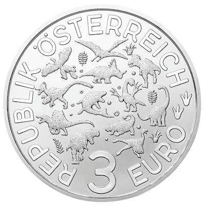 Der Dino ist in intensivem Blau und Orange koloriert. Im Dunkeln leuchten seine Umrisse nach. Unten ist der Name verzeichnet. Umseitig findet man den ungewöhnlichen Nennwert von 3 Euro. Die Wertseite zeigt außerdem alle zwölf Dinosaurier und Flugsaurier, die in dieser Serie erscheinen, in scherenschnittartiger Darstellung. Die Buntmetallmünze wiegt 16 Gramm und hat einen Durchmesser von 34 Millimetern. Die Auflage ist auf 65.000 Stück limitiert.