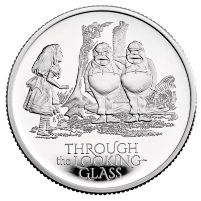 alice-hinter-den-spiegeln-half-oz-silber-koloriertKinderreime dienten Lewis Carroll als Inspiration für Alice hinter den Spiegeln. Aus einem solchen stammen zum Beispiel Zwiddeldum und Zwiddeldei, denen Alice im Wald begegnet. Die dicken Zwillingsbrüder tragen ihr zunächst das Gedicht vom Walross und dem Zimmermann vor und machen sich anschließend bereit zum Kampf, fliehen dann aber vor einer großen Krähe. Sie sind nicht die einzigen bekannten Figuren, die Carroll verwendete. Wenig später begegnet Alice Humpty Dumpty sowie dem Löwen und dem Einhorn, die ebenfalls aus Kinderreimen stammen. Einen kurzen Auftritt haben auch der Märzhase und der verrückte Hutmacher aus dem ersten Buch.