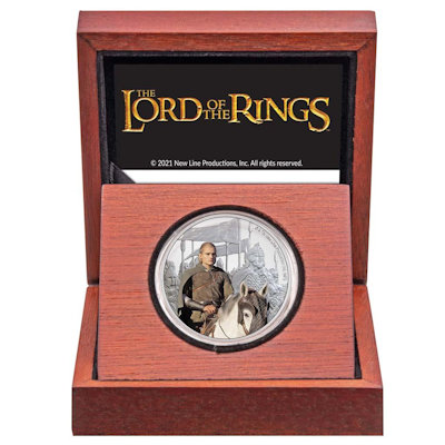 Neben seinem scharfen Auge, der übermenschlichen Leichtfüßigkeit und seiner schier unfehlbaren Treffsicherheit mit dem Bogen zeichnet sich Legolas auch durch seine Reitkünste aus. Letztere würdigt die neue Silbermünze, die den Elben auf seinem Pferd Arod, einem Geschenk der Reiter von Rohan, zeigt. Die beiden stehen in der Schlachtreihe, heben sich aber mit Farbapplikationen von den anderen Kriegern ab. Anders als diese verzichtet der flinke Legolas auf Helm und Kettenhemd. Verkörpert wurde der blonde Elbenkrieger von Orlando Bloom, der nicht nur mit The Lord of the Rings, sondern auch mit Fluch der Karibik Erfolge feierte.